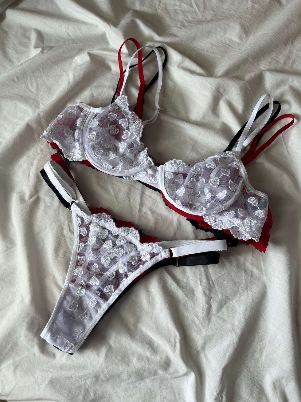 Conjunto de sutiã e calcinha, feito em tule bordado de corações, com aro e sem forro, valorizando a transparência e a delicadeza.