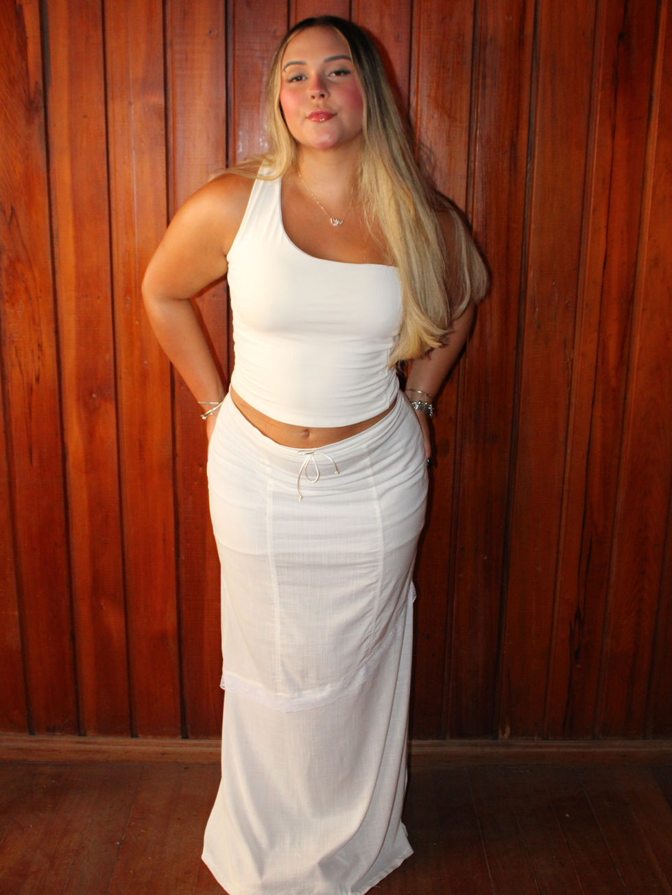 A Saia Infinity Grace traz camadas assimétricas de viscose fluida e sobreposição de renda para um visual único e sofisticado.
